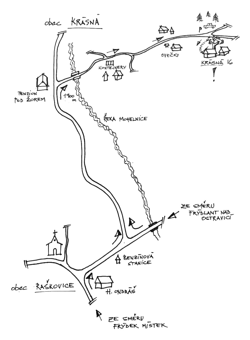 ze strany od Frýdku - Místku, pojedete výjezdem (Žermanice, Nošovice, Dobrá) po trase Nošovice, Nižní Lhoty, Vyšní Lhoty, Raškovice, kde u Hotelu Ondráš odbočíte doprava, projedete kolem čerpací stanice, za kterou odbočíte vlevo směr Visalaje, pojedete cca 2km a po levé straně uvidíte Penzion pod Žorem u kterého odbočíte doprava a pojedete dalších 1,9km pořád rovně až dojedete k mostku, za nímž se rozdvojují cesty. Před mostkem po levé straně je parkoviště, kde zaparkujete, tak aby se vedle vás umístily další vozy a půjdete naproti od parkoviště do kopečka k naší chaloupce.